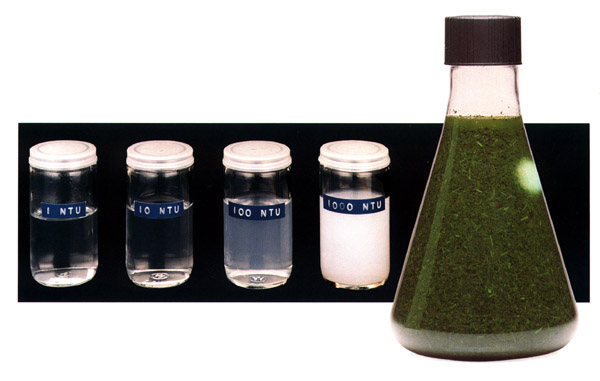 example_glass_jars.JPG (48910 bytes)The above bottles labeled 1 NTU, 10 NTU, 100 NTU and 1,000 NTU show actual concentrations in Nephelometric Turbidity units of formazine in turbidity-free water.  As you can see, the human eye can barely see the difference between concentrations of 1 and 10 NTU.  McNab turbidity measuring devices are so sensitive they can detect the difference between these two concentrations in 1000-part increments.
